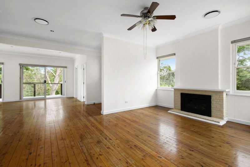 - Spacious lounge with fireplace and dining area opening to covered entertaining balcony with treetop views