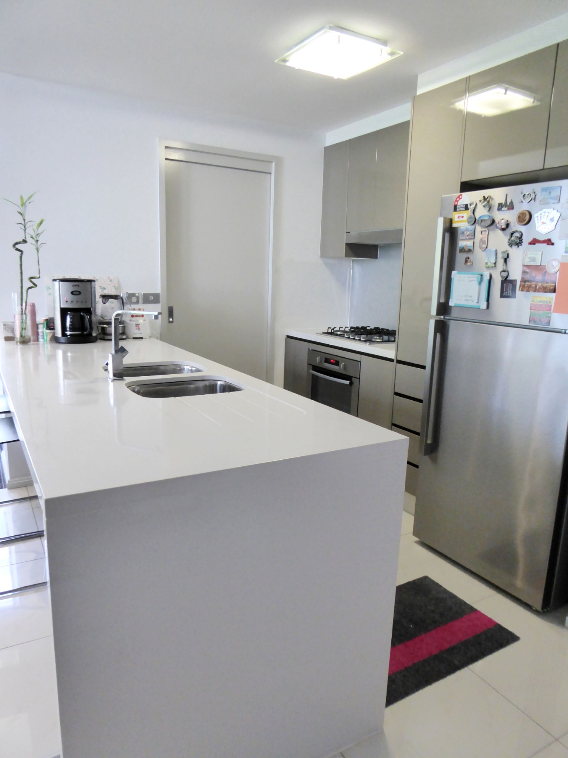 - Open plan kitchen with Caesar stone benches and stainless steel appliances