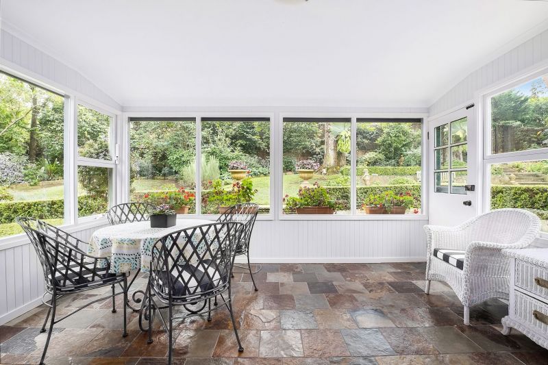 * Bright sunroom with stone flooring and automated blinds