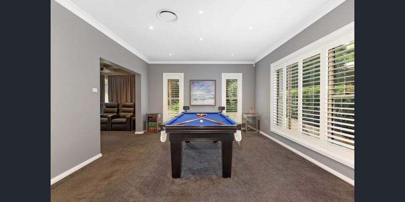 * Large formal lounge/billiard room, custom appointed home theatre with cabinetry, speakers, screen and projector