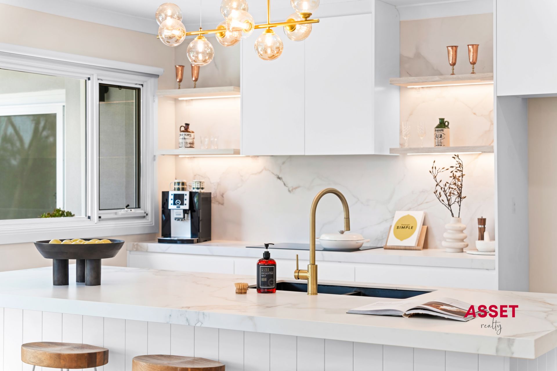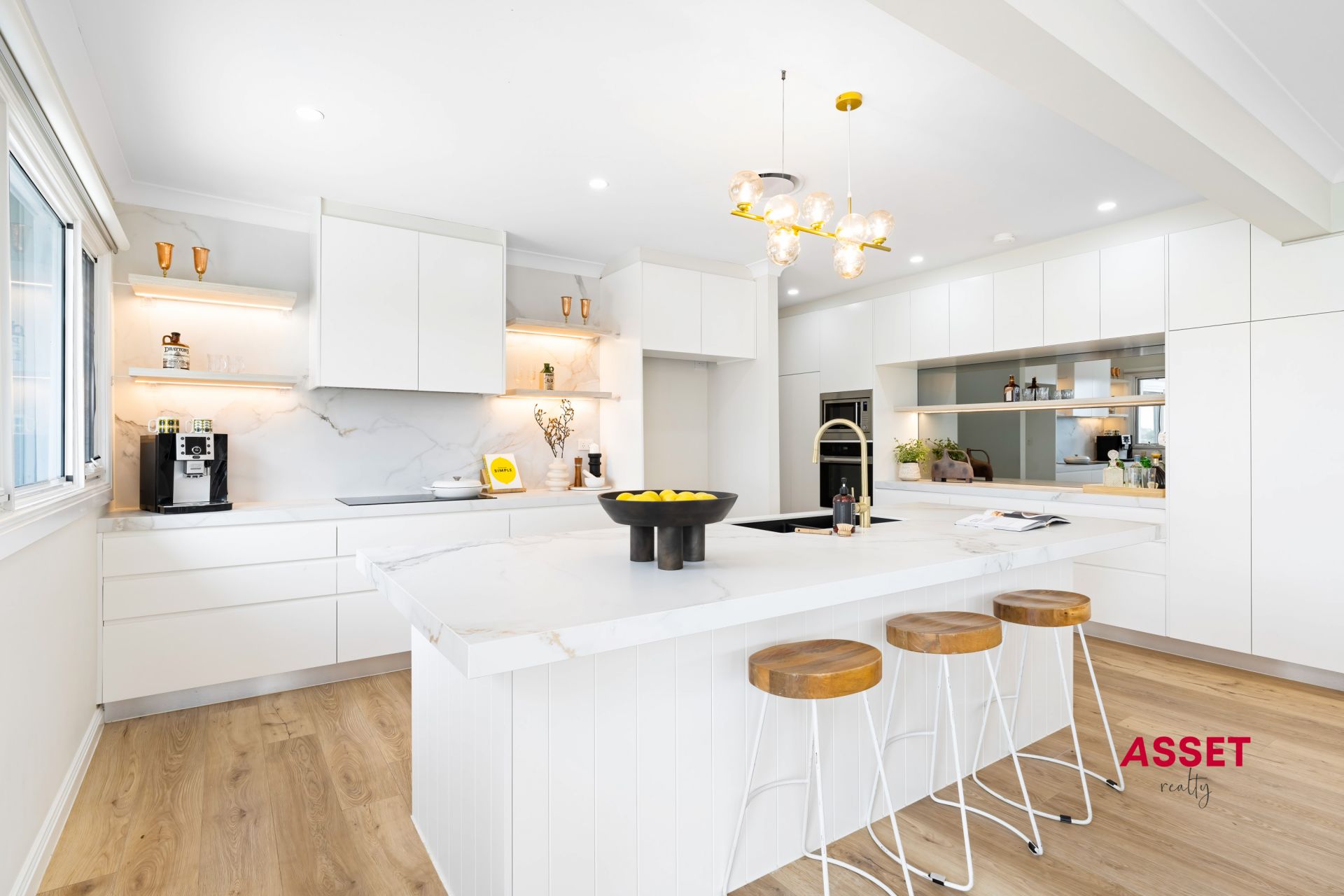 -Luxury open-plan new kitchen featuring Miele/Smeg appliances, a 60mm stone benchtop island, and stylish Italian brushed brass metal tapware.