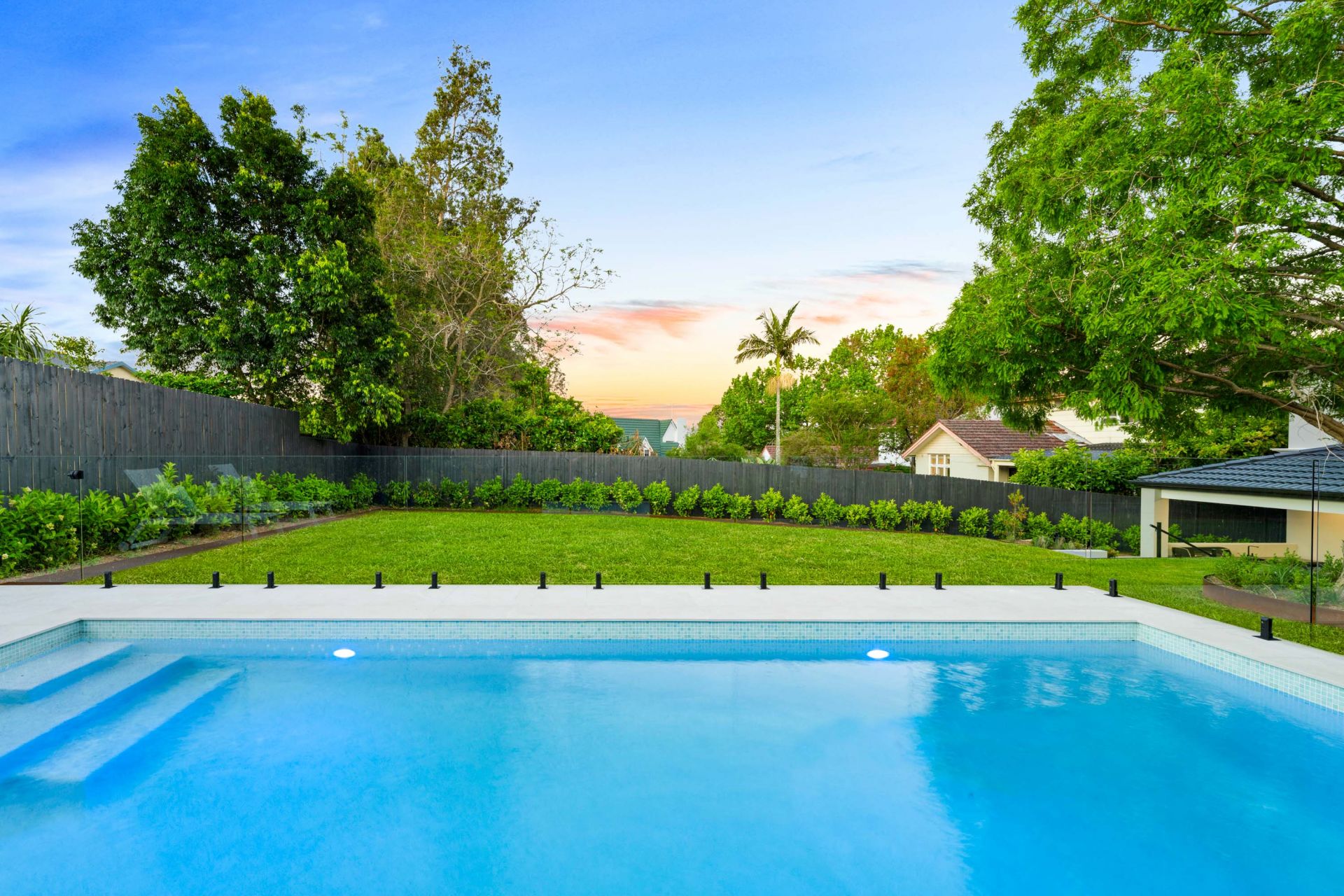 • Huge child/pet friendly backyard with lush lawns, entertainer's terrace and sparkling mosaic-edged pool with water feature and sunlit surrounds