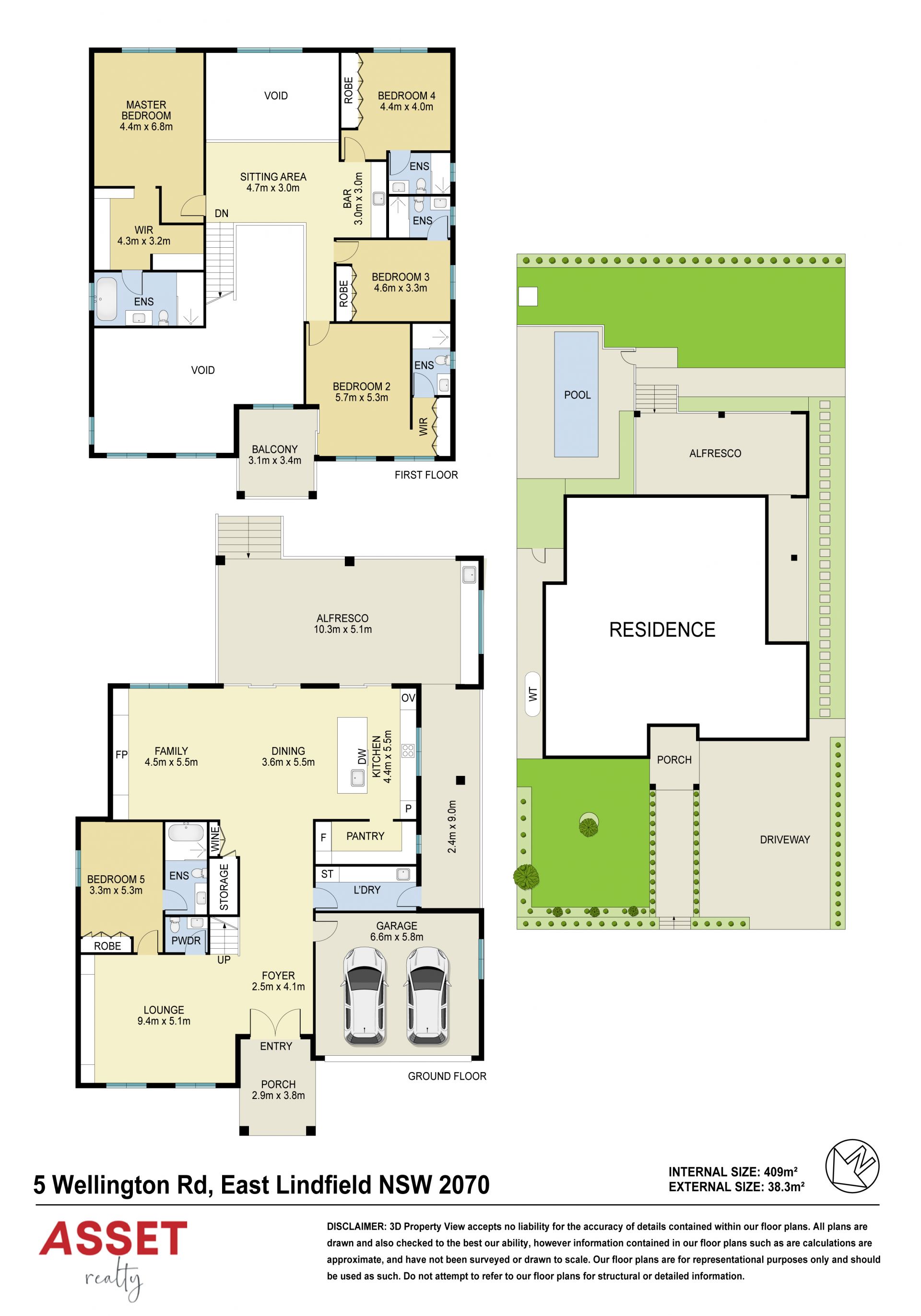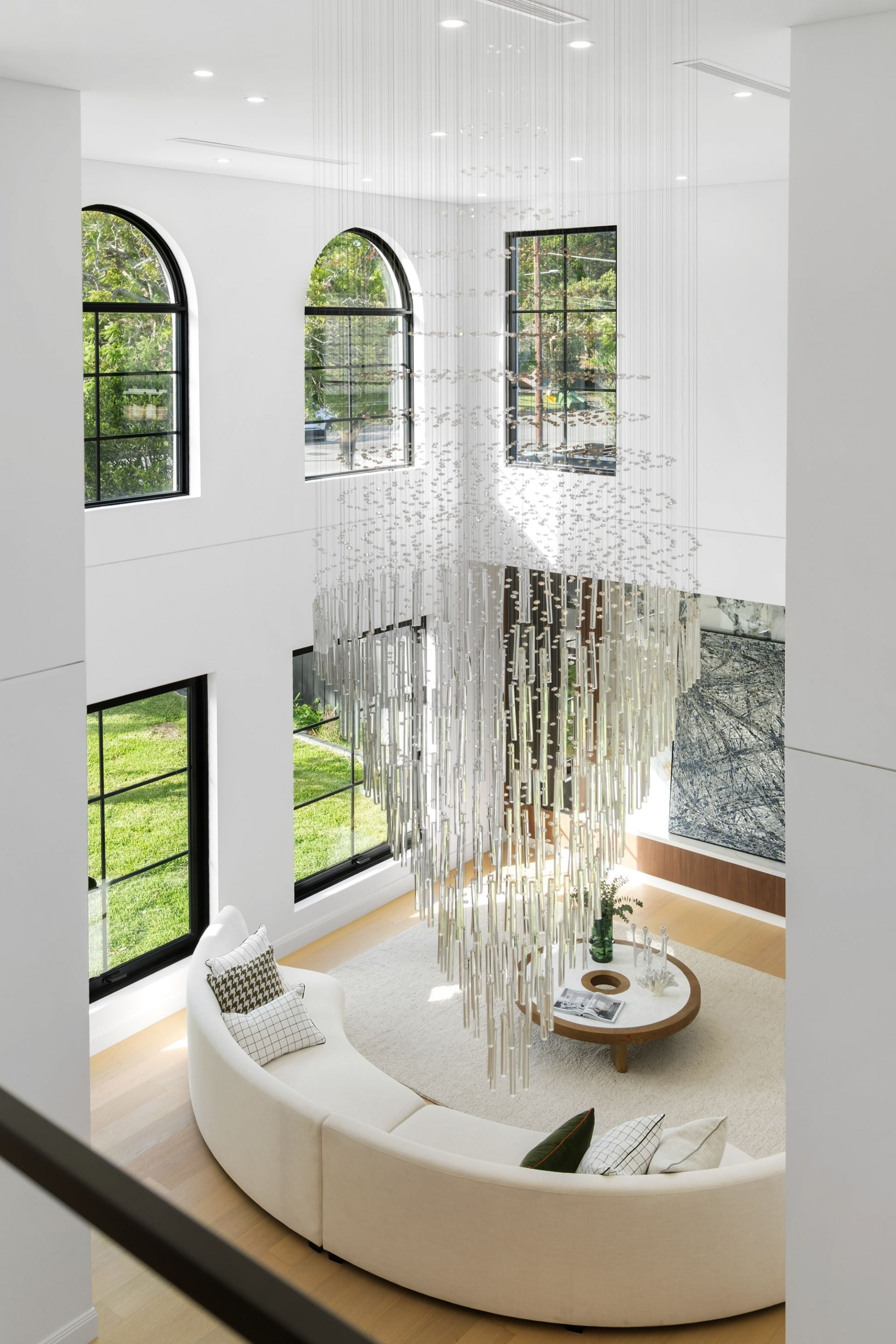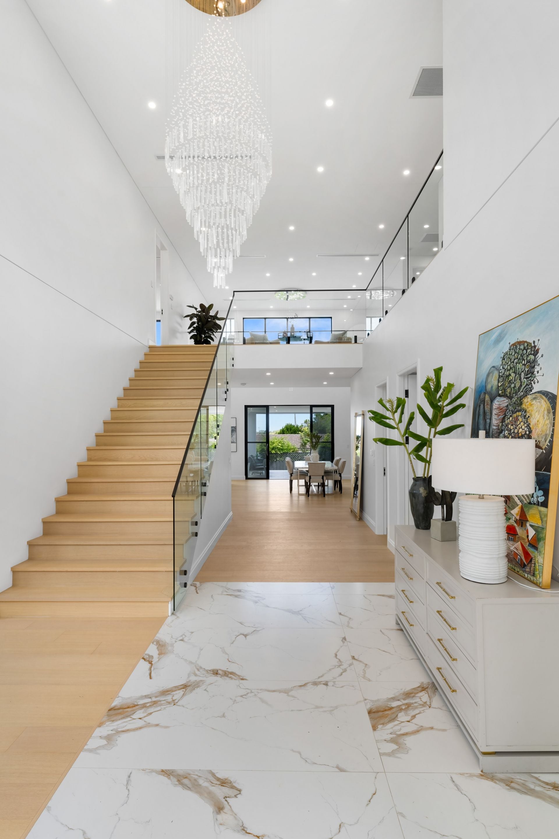 - Grand double-height entry foyer with designer chandeliers, architectural timber staircase and glass balustrade. 439 sqm in total area