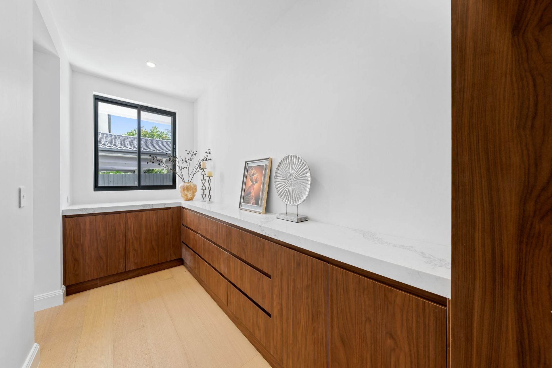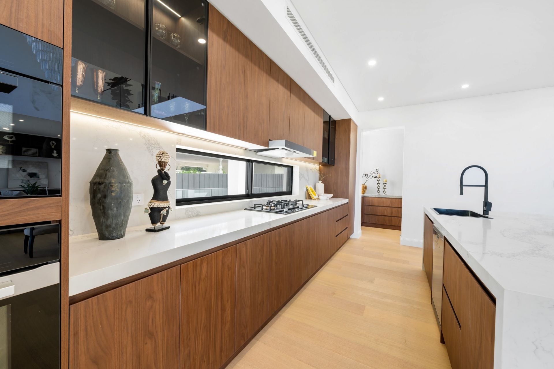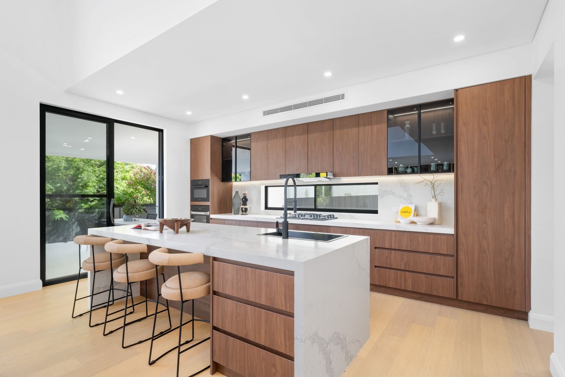 - Showpiece kitchen with oversized stone waterfall island, premium timber cabinetry, integrated high-end appliances and separate butler's pantry with extensive storage