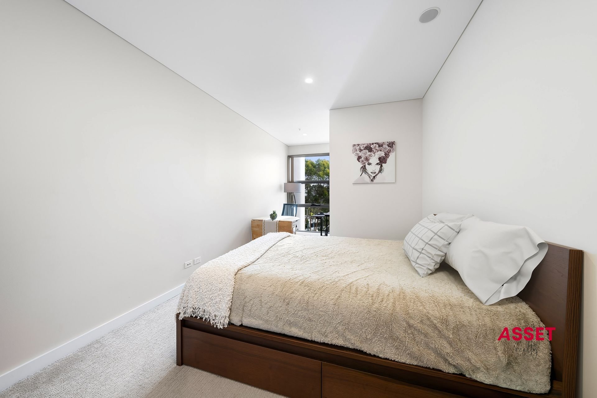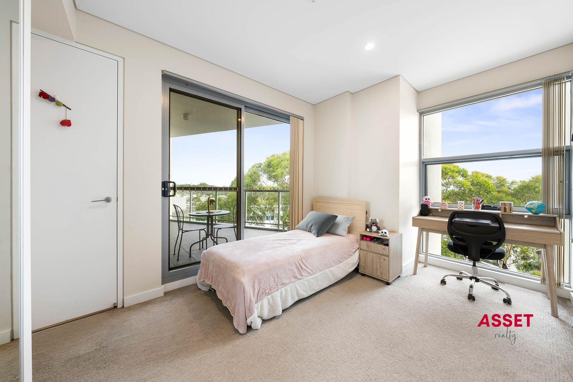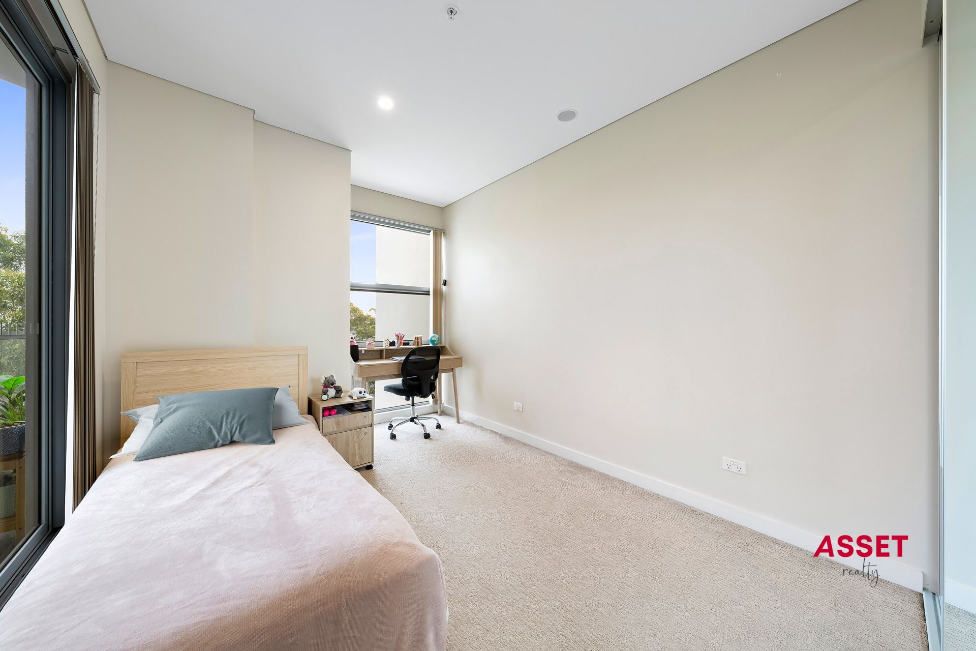 • Luxurious Master Suite: Features a generously sized ensuite and a large walk-in wardrobe, along with a dedicated study area filled with natural light through floor-to-ceiling glass windows.