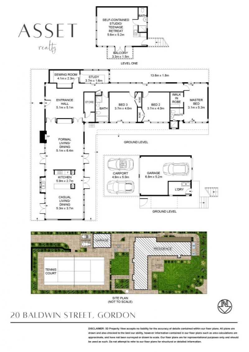 The whole property consists of the main residence encompassing 4 bedrooms, 3 bathrooms, kitchen, formal and informal living/dining rooms, a study, a storage room, garage featuring a fully self-contained studio or teenage/in-laws retreat above it, level front and rear lawn, outdoor entertaining area and a full sized tennis court. With sprawling grounds and generous living spaces, this home is perfectly suited for a growing family as well as a multigenerational family who could take advantage of the fully self-contained studio.