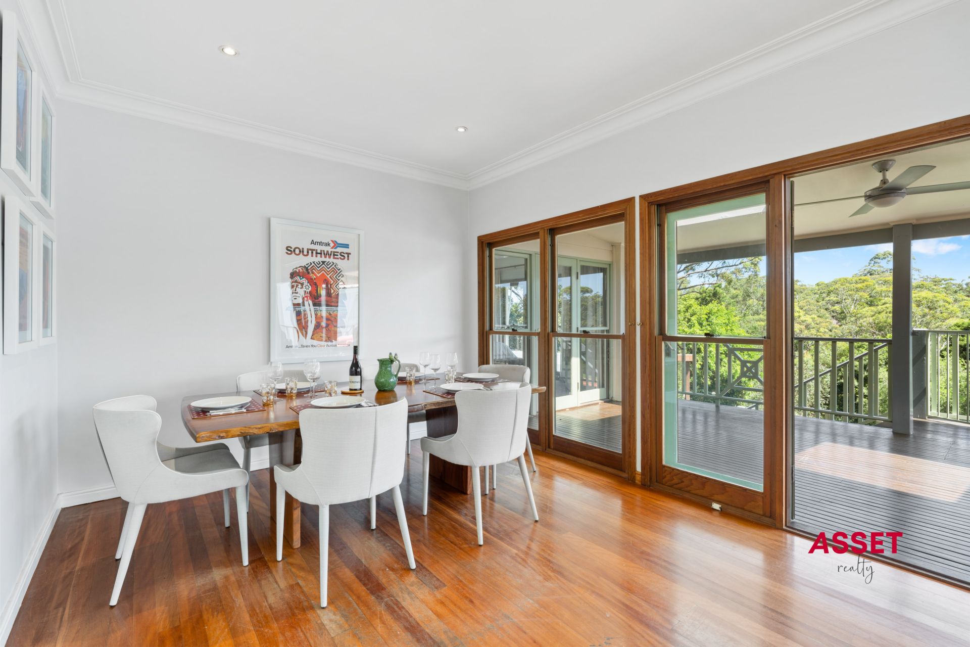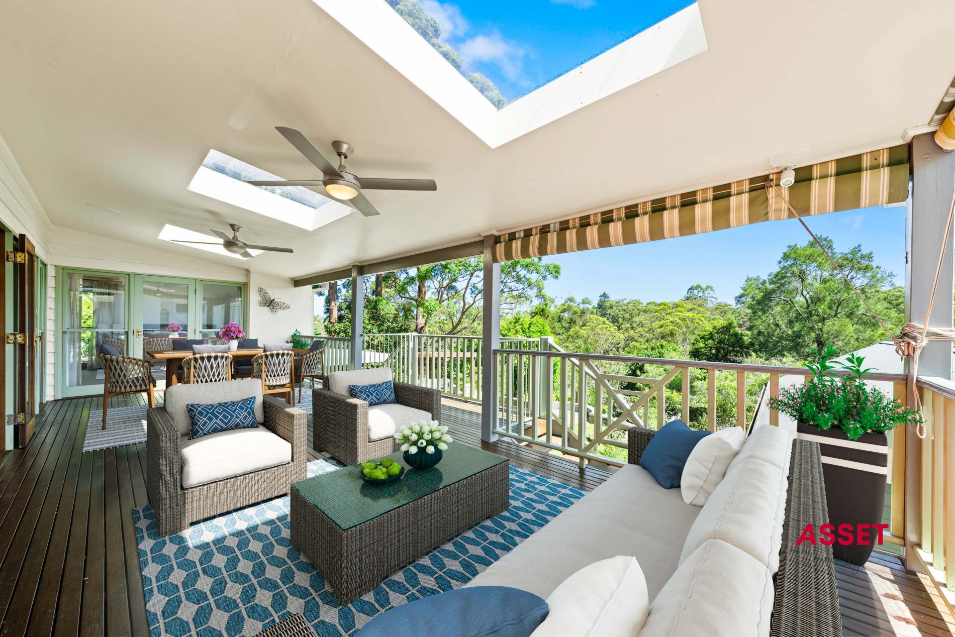 Large dining room and family area featuring wall-to-wall windows and doors that open to elevated covered deck with ceiling fans and sky lights