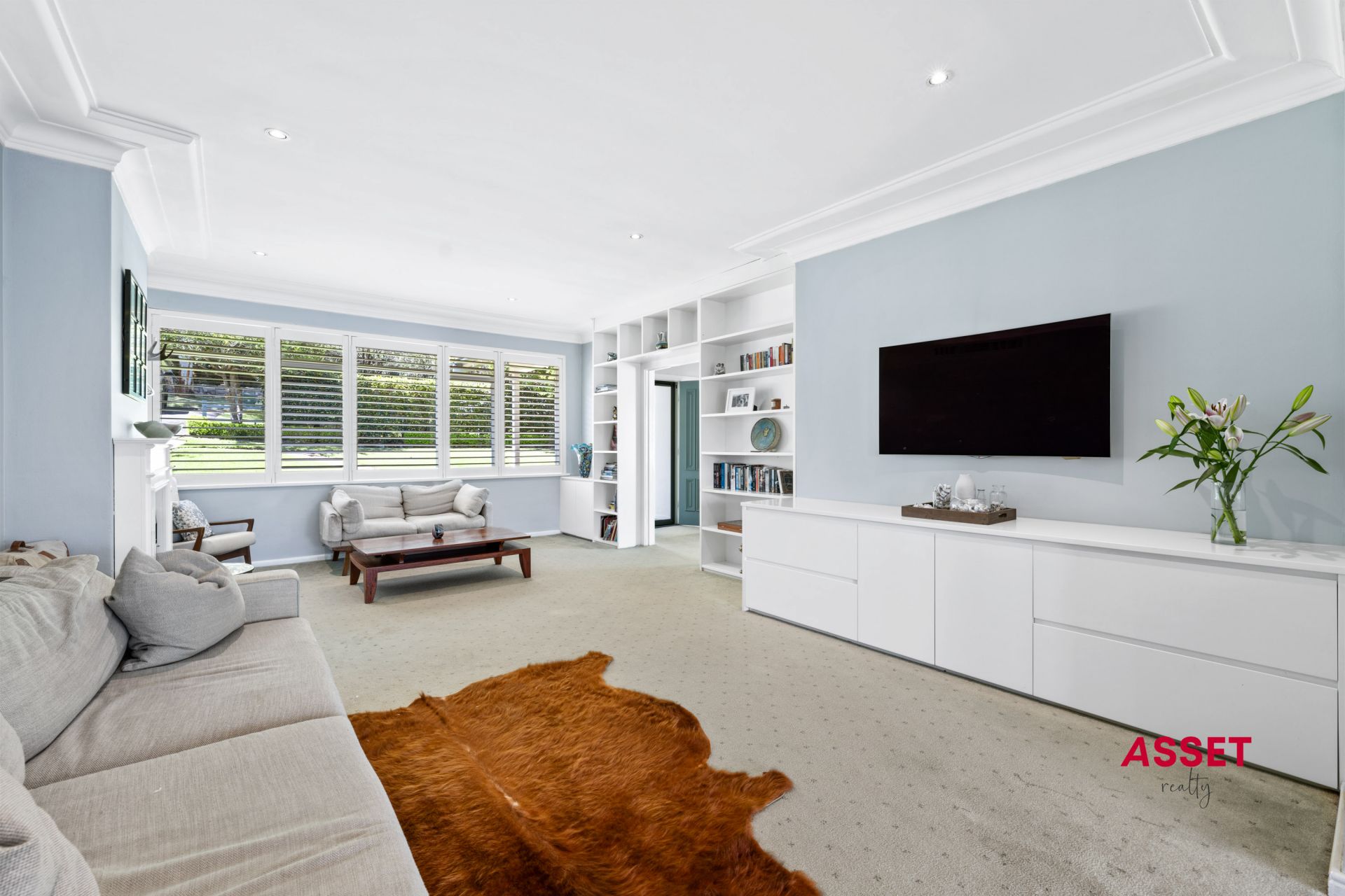 Expansive formal lounge room with gas fireplace and built-in bookshelves