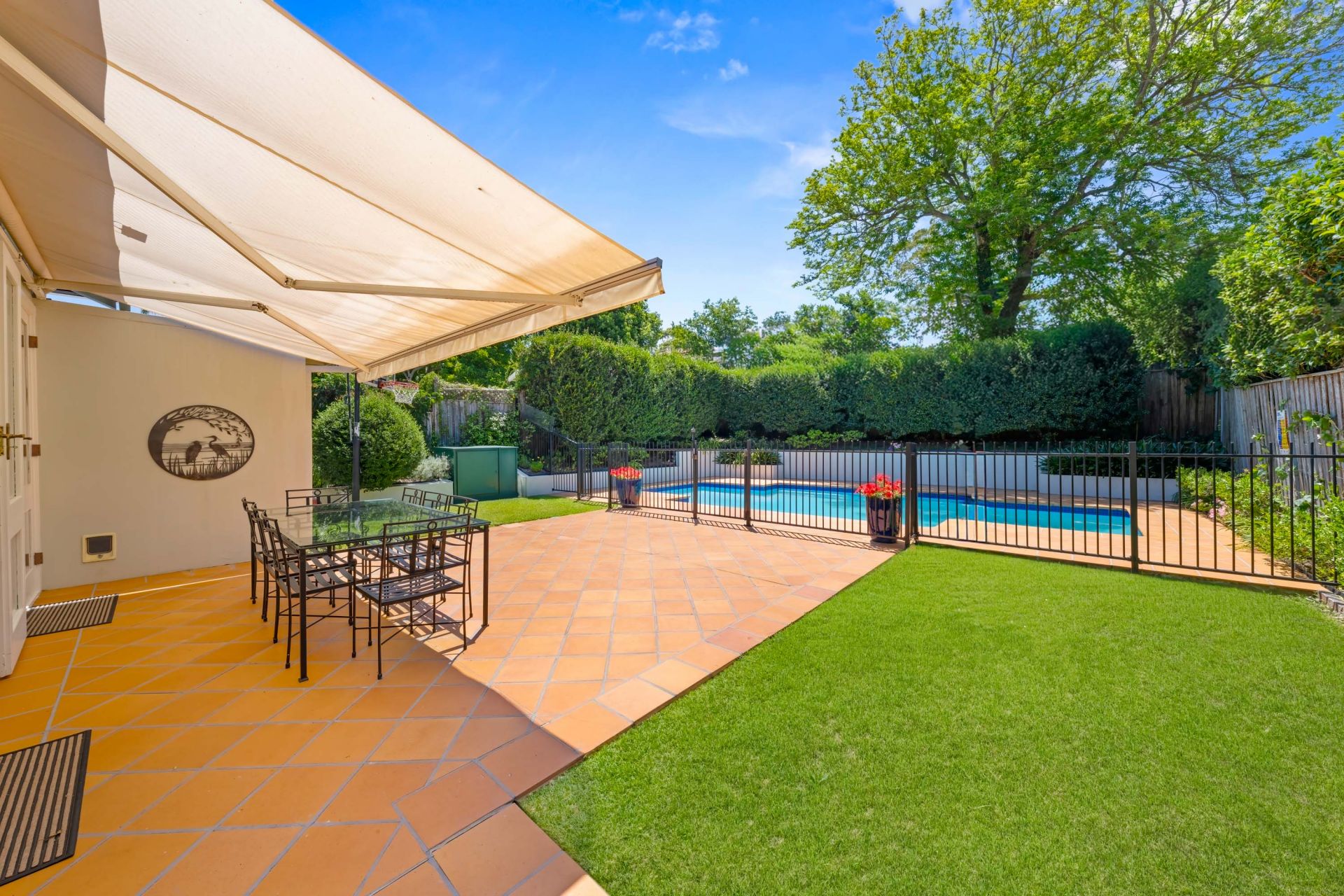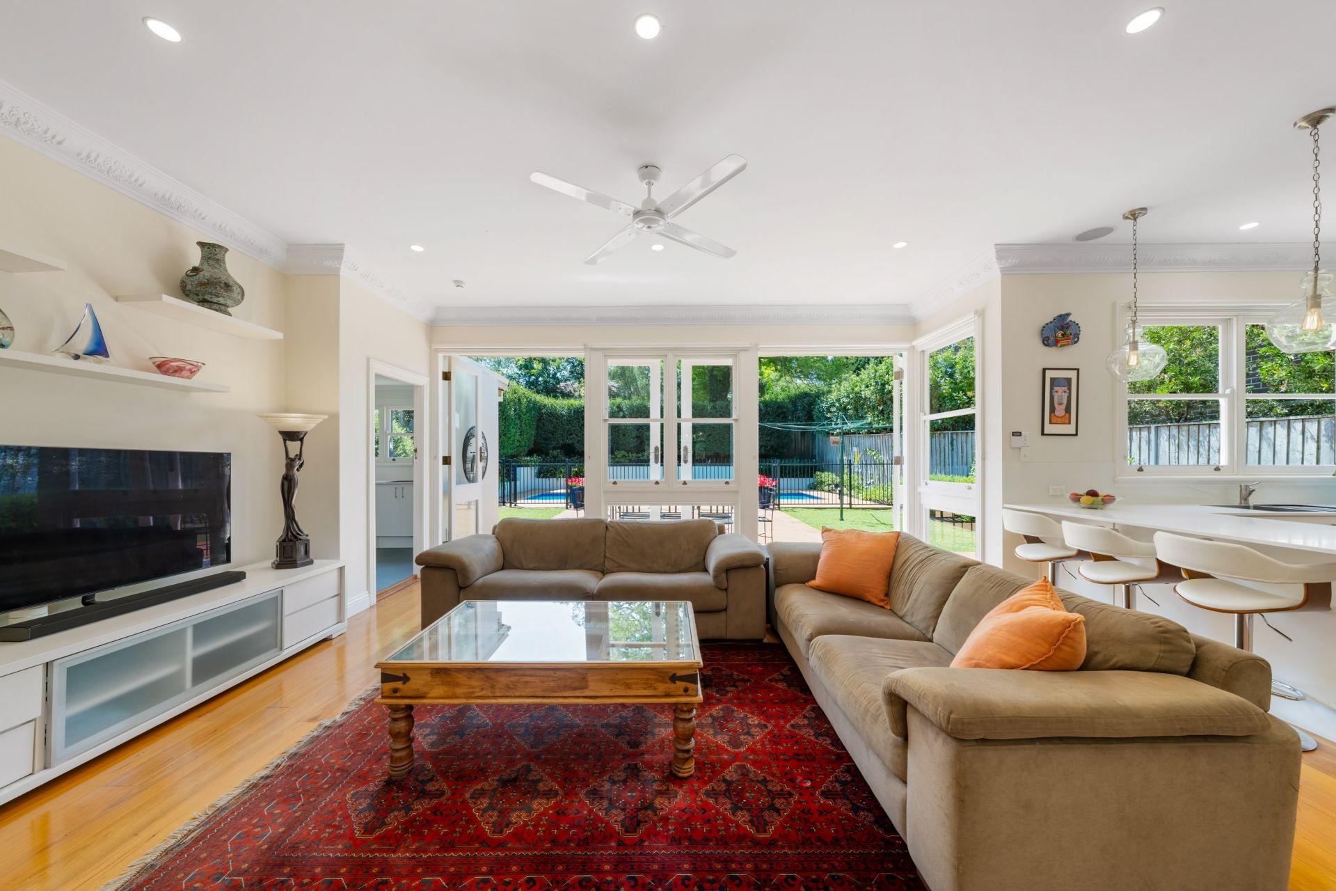 •Sunlit family living flows seamlessly to the north-to-rear outdoor entertaining terrace with retractable awning