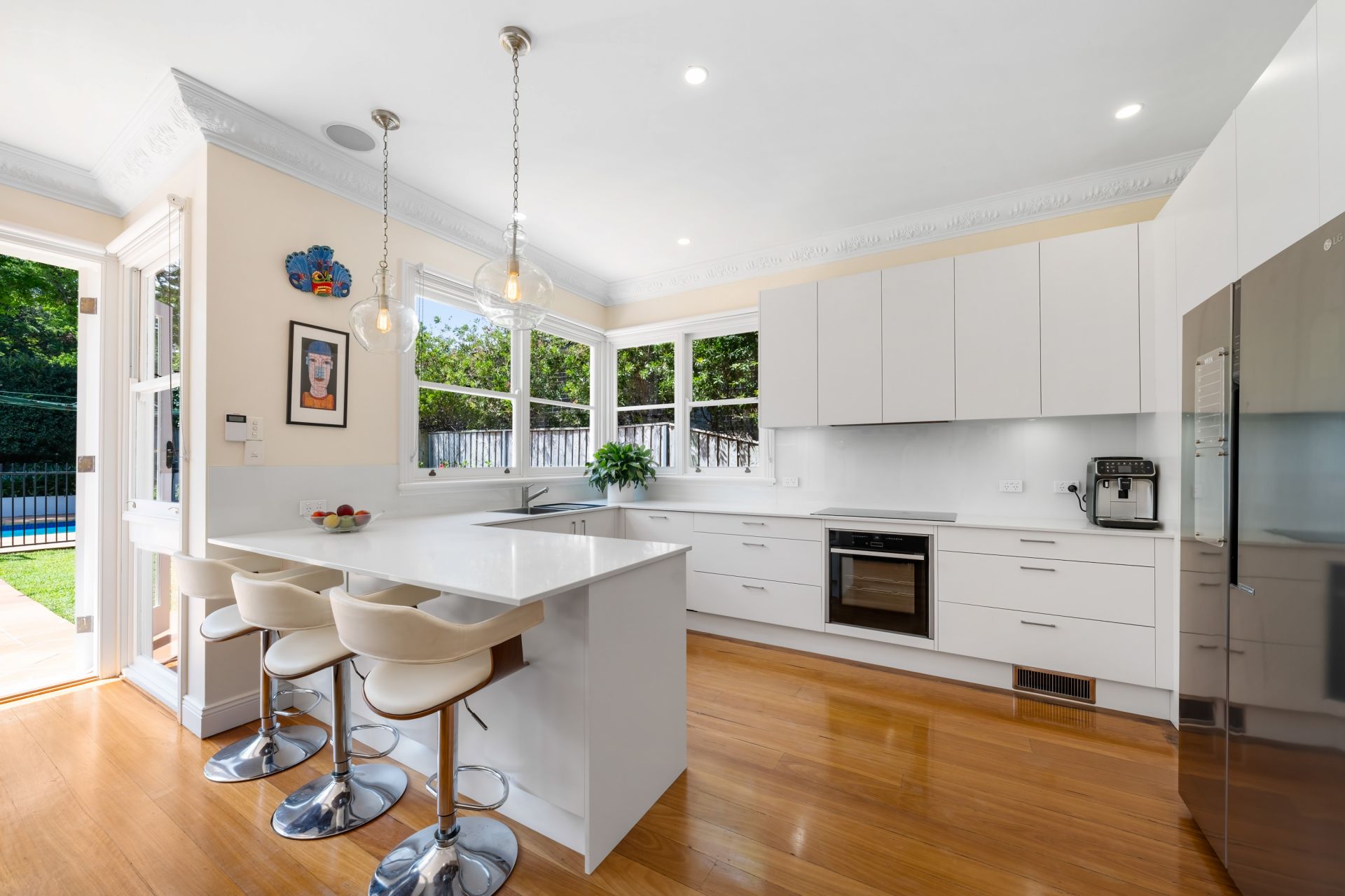 Beyond its charming façade, the home reveals an atmosphere of timeless sophistication and warmth. Light-filled interiors, soaring pressed metal ceilings and exquisite ornamental fireplaces combine to create an immediate sense of grace and elegance. A blend of formal and informal spaces offers a harmonious balance of living and entertaining options.