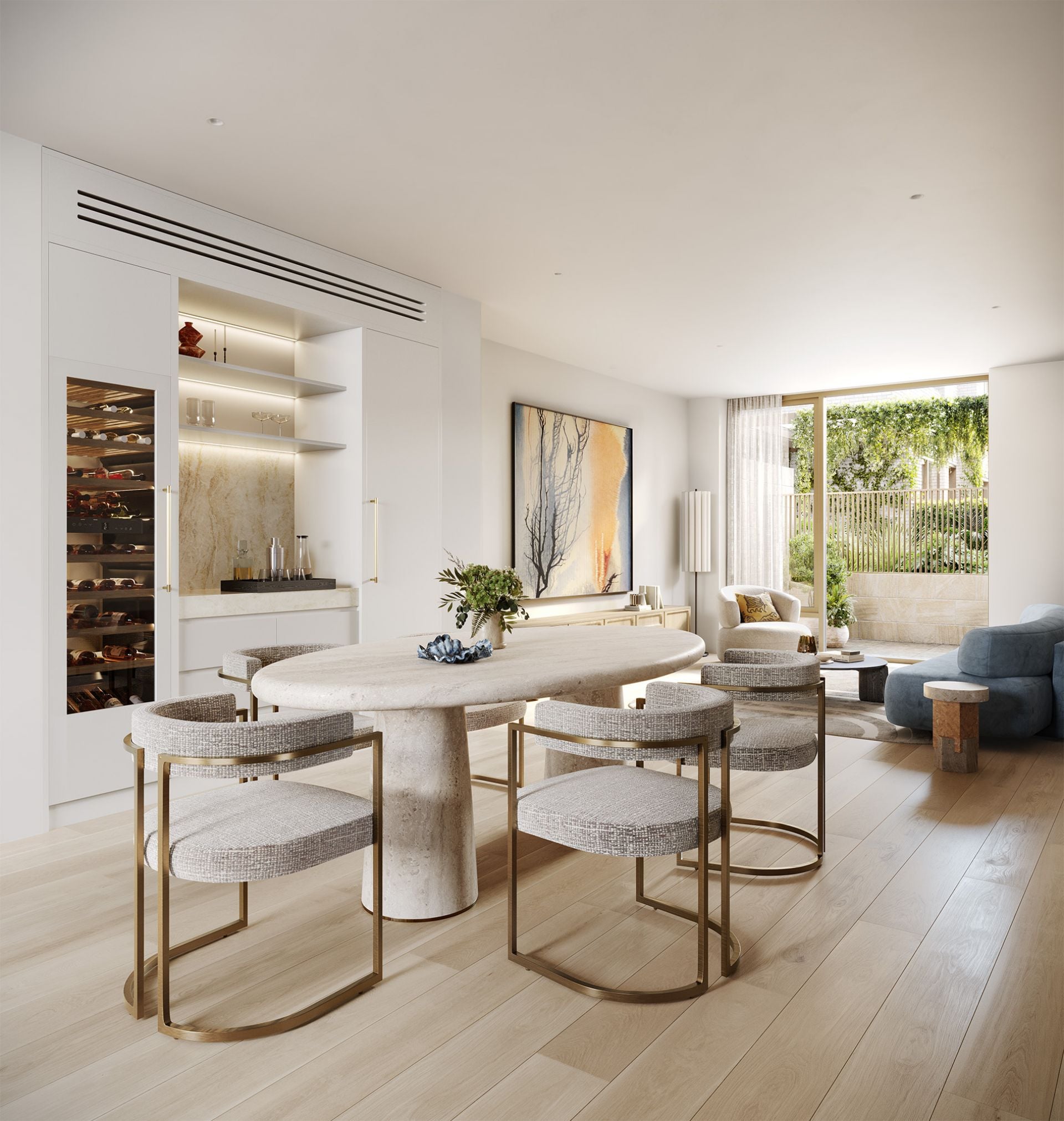 Entertaining spaces are generous, with a range of home layouts providing open-plan living options. Engineered oak flooring adds warmth throughout the spaces whilst a selection of homes include elegant fireplaces. Integrated bespoke joinery in the dining room has been crafted to include a backlit bar area and wine fridge, creating the perfect environment for entertaining.
