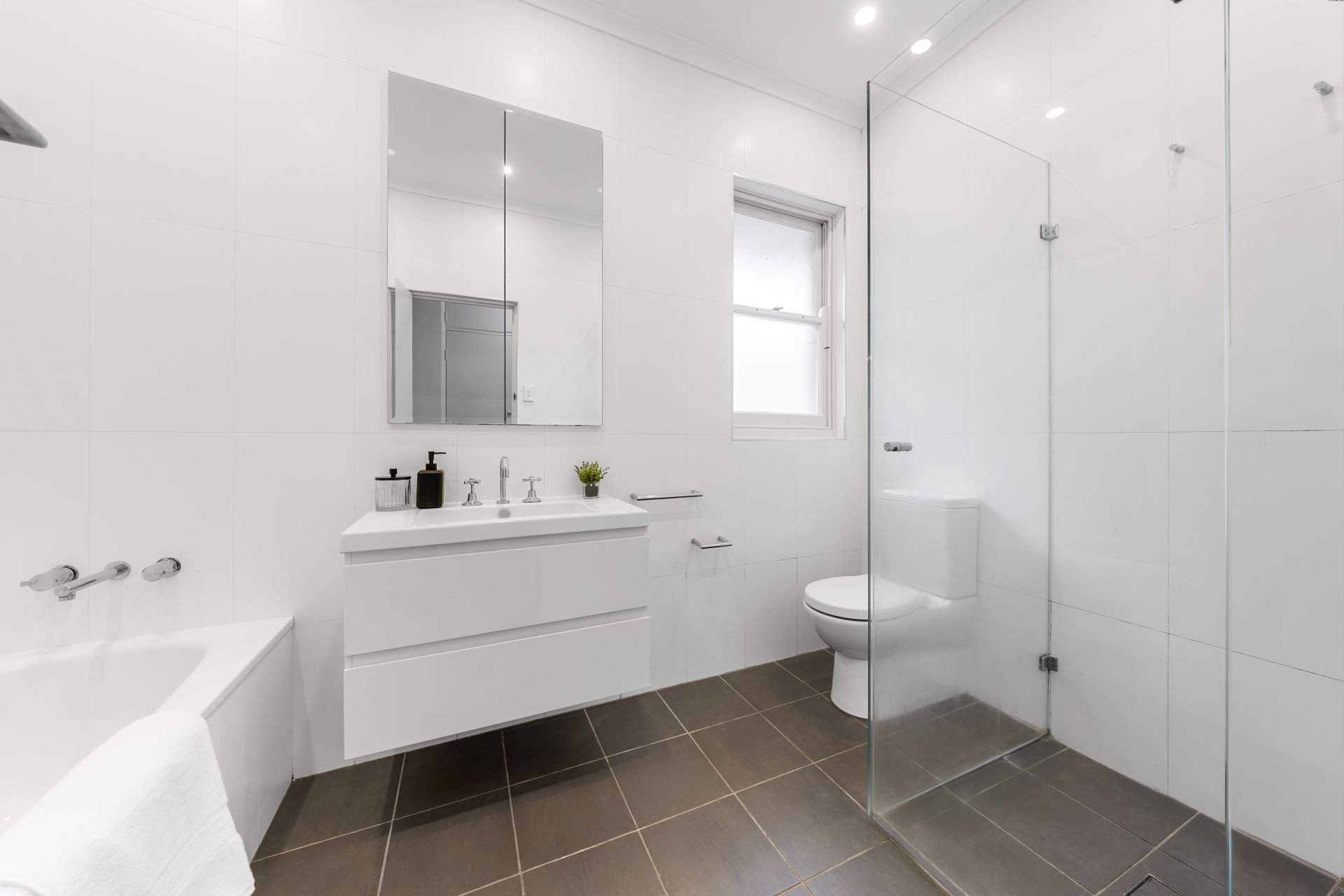 • Three full bathrooms, all with frameless glass showers, including ensuite downstairs