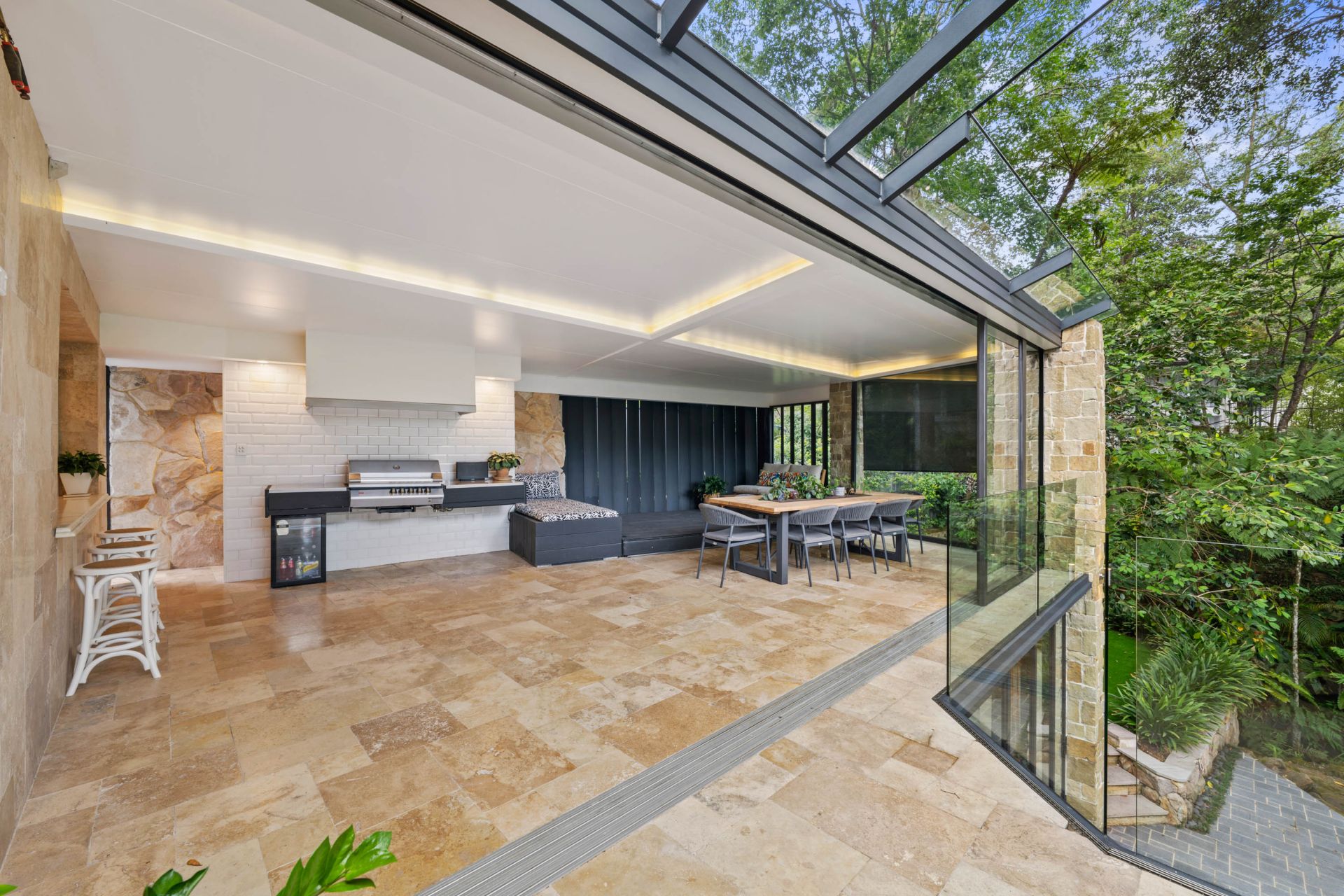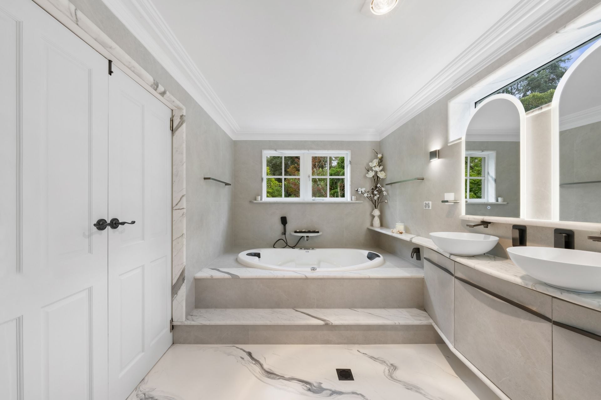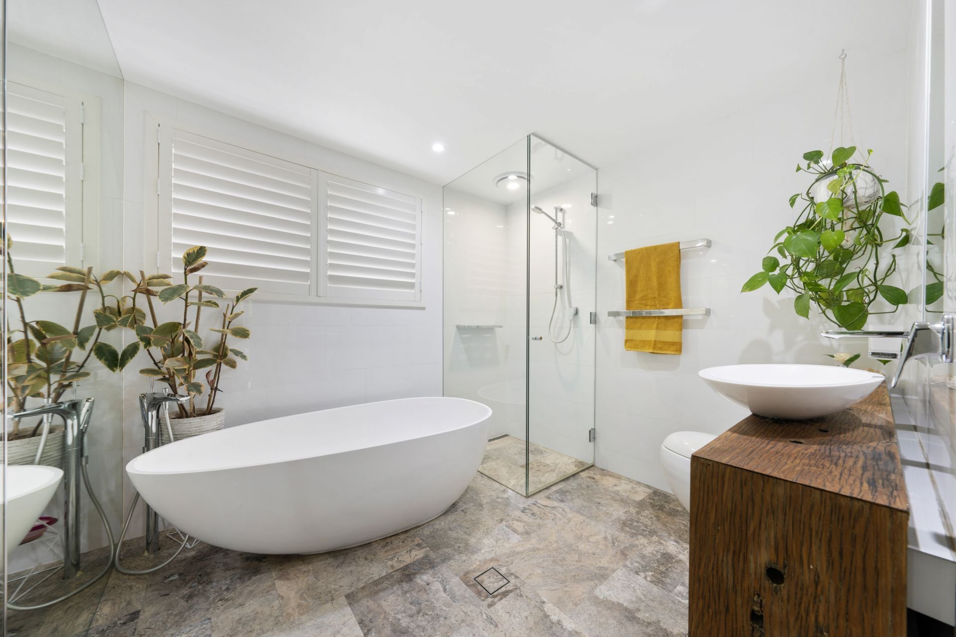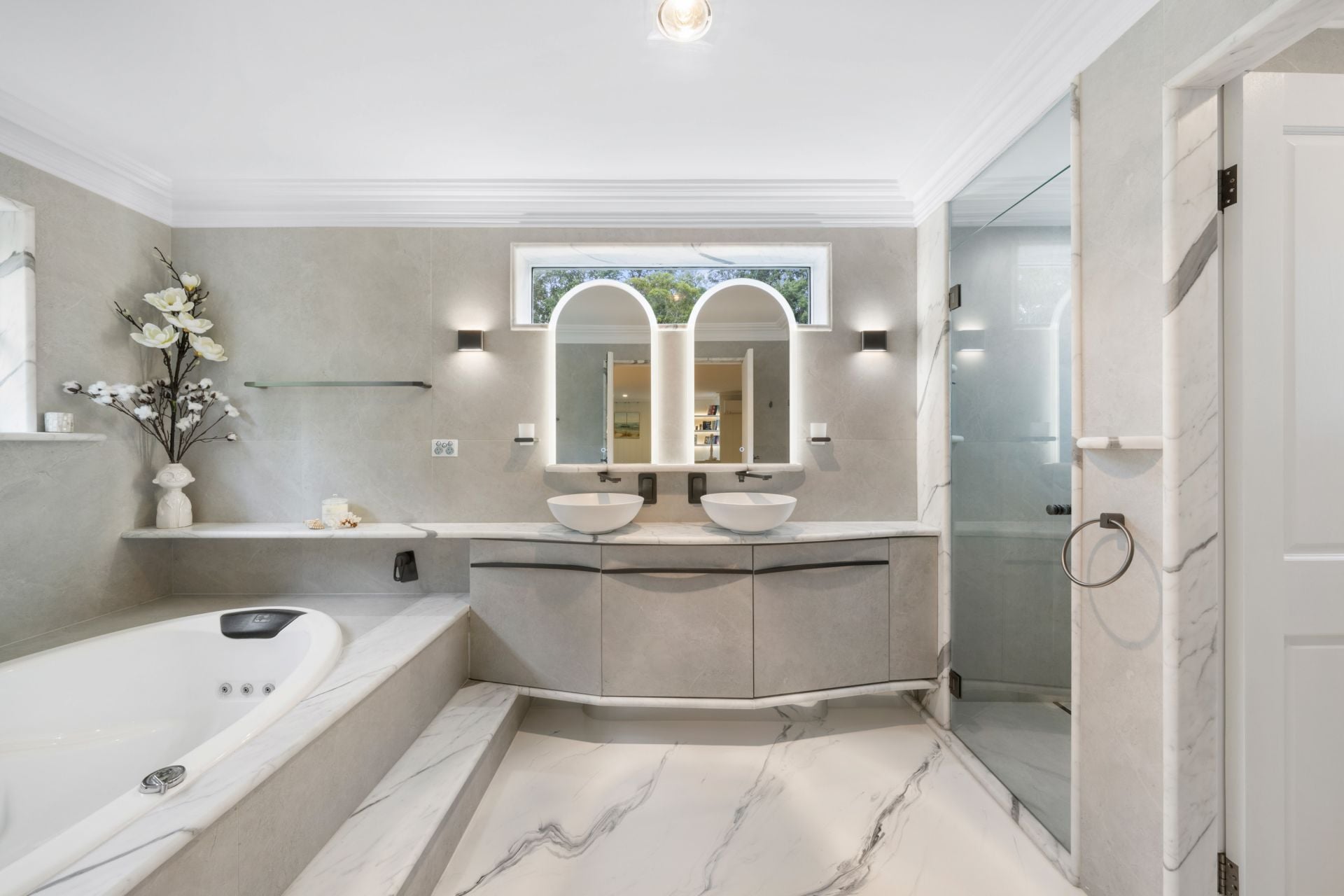 • Grey limestone tiled bathroom with premium finishes and aged ironbark features. Led strip lighting creating ambience in ceilings and features.
