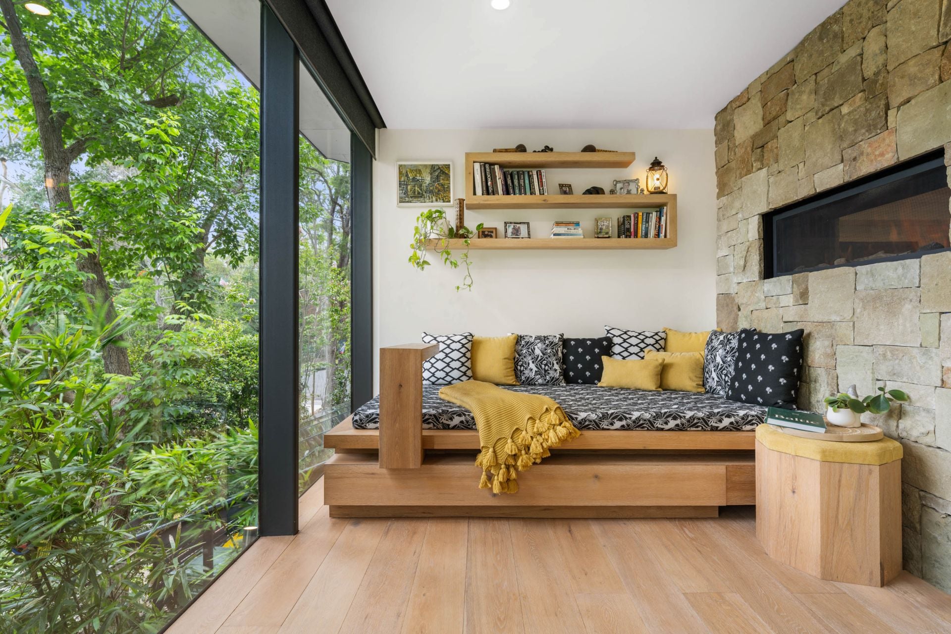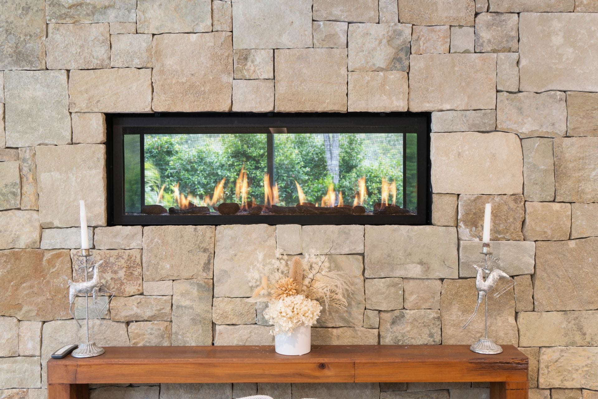 • Designer living space featuring an Italian double sided stone fireplace with daybed.