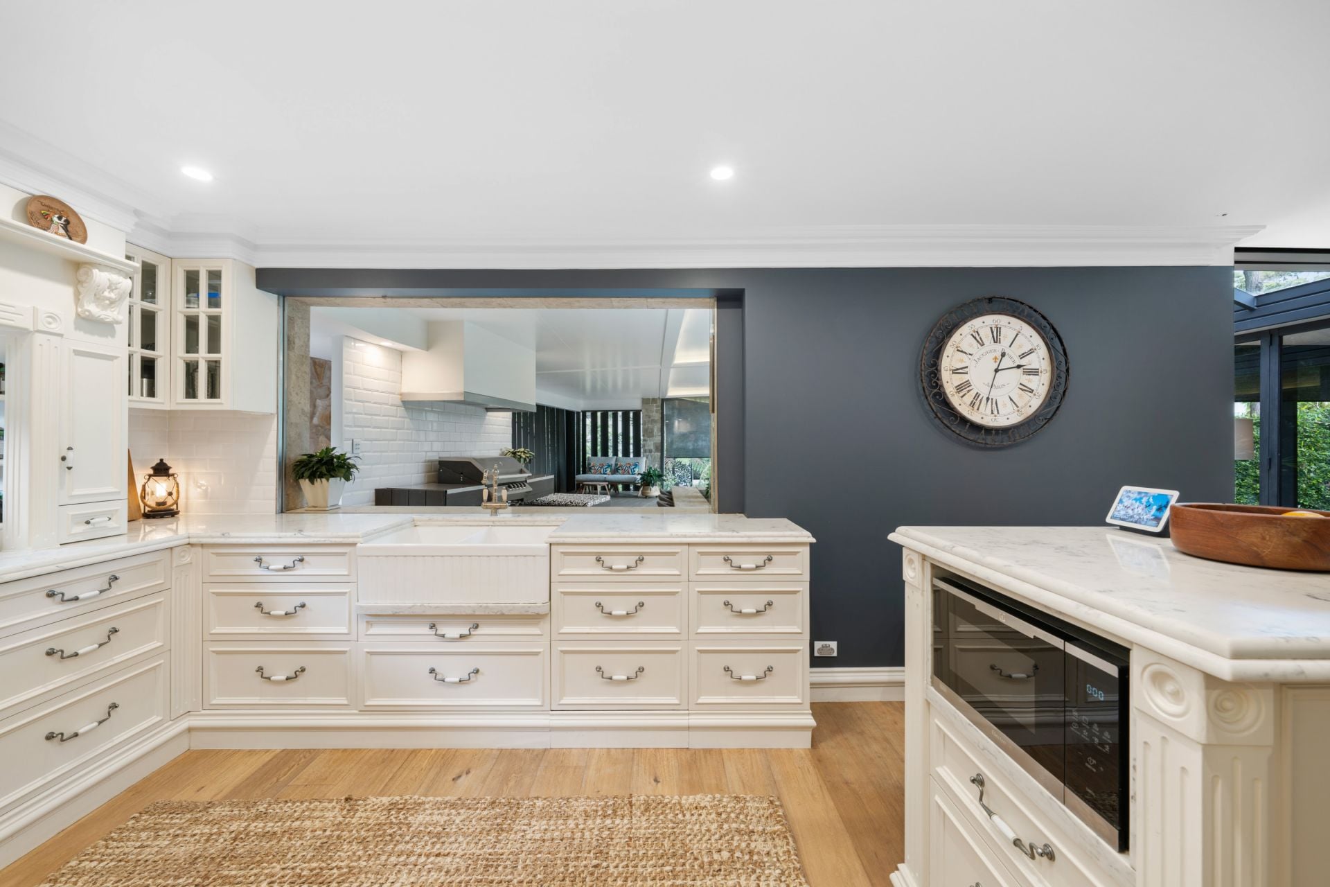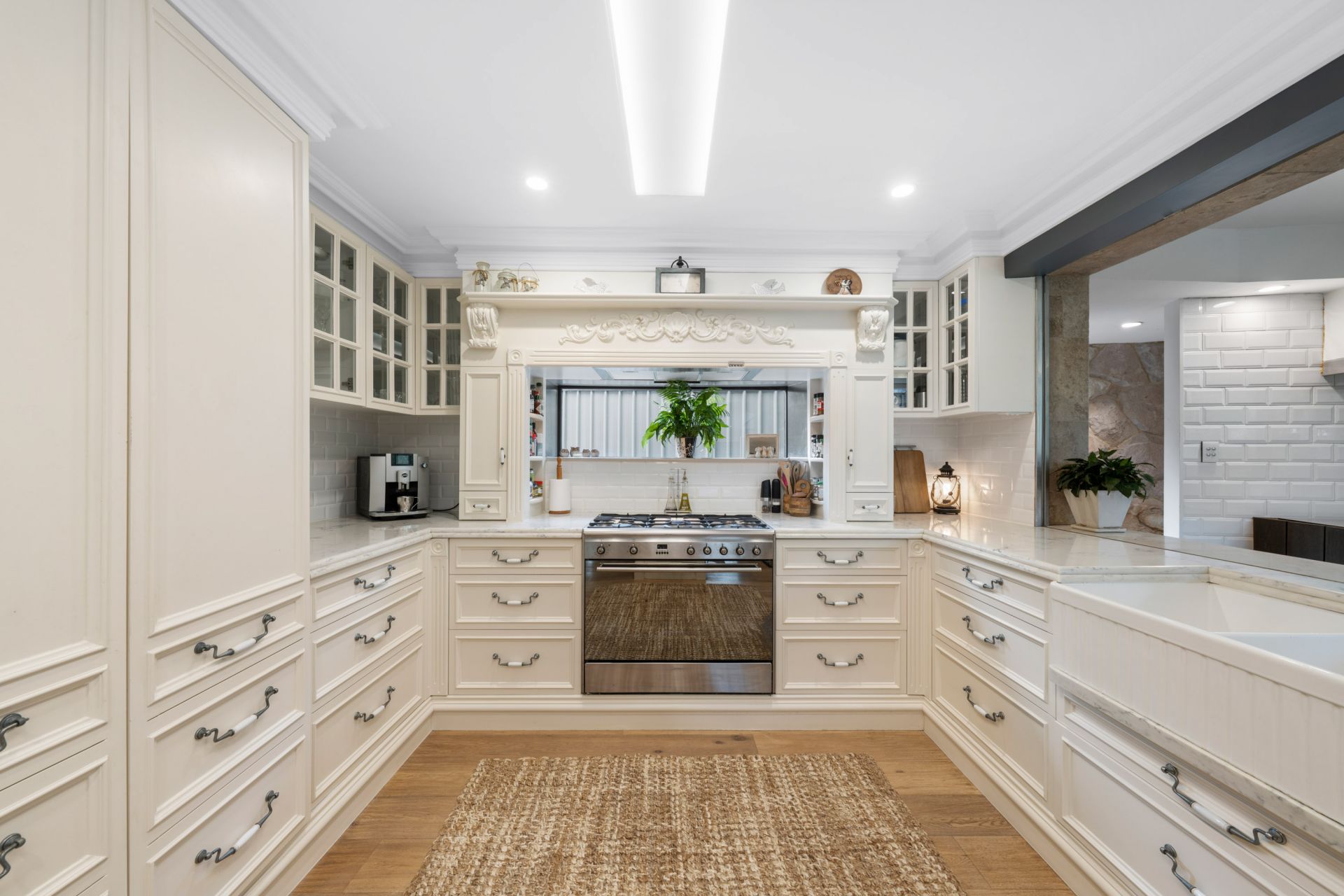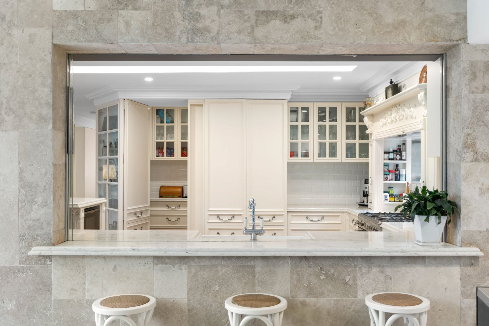 • French-styled kitchen with marble benchtops, walk-in pantry and hidden storage.