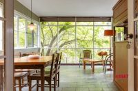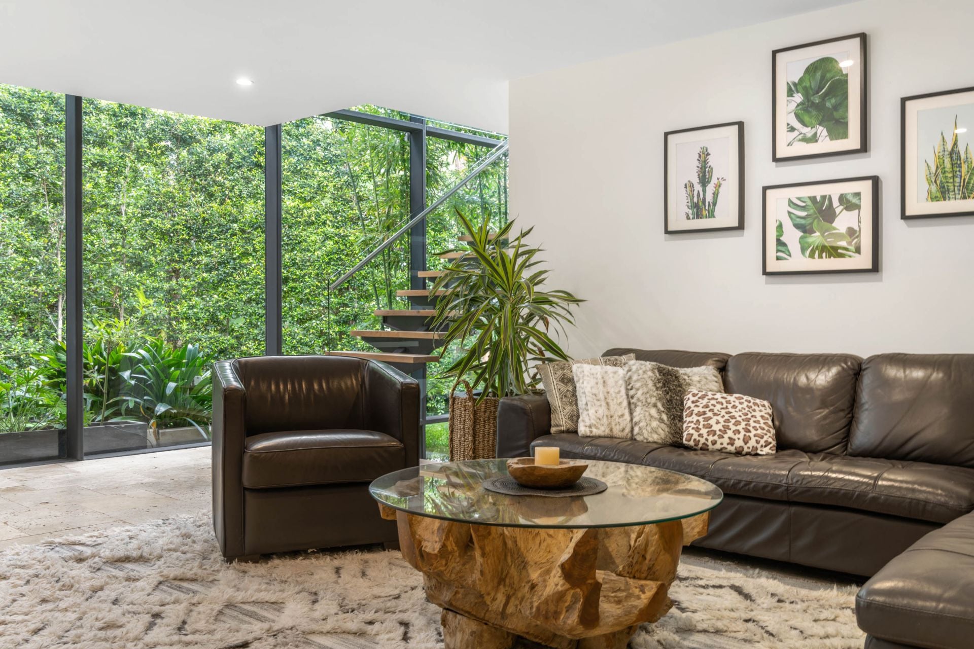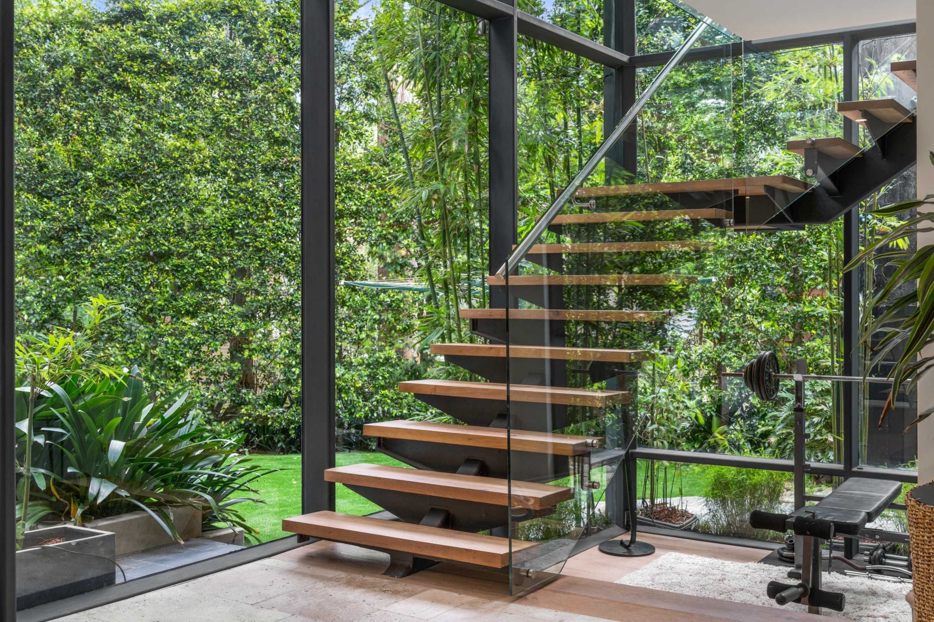 • Glass curtain wall featuring the greenery, behind the elegant floating staircase.